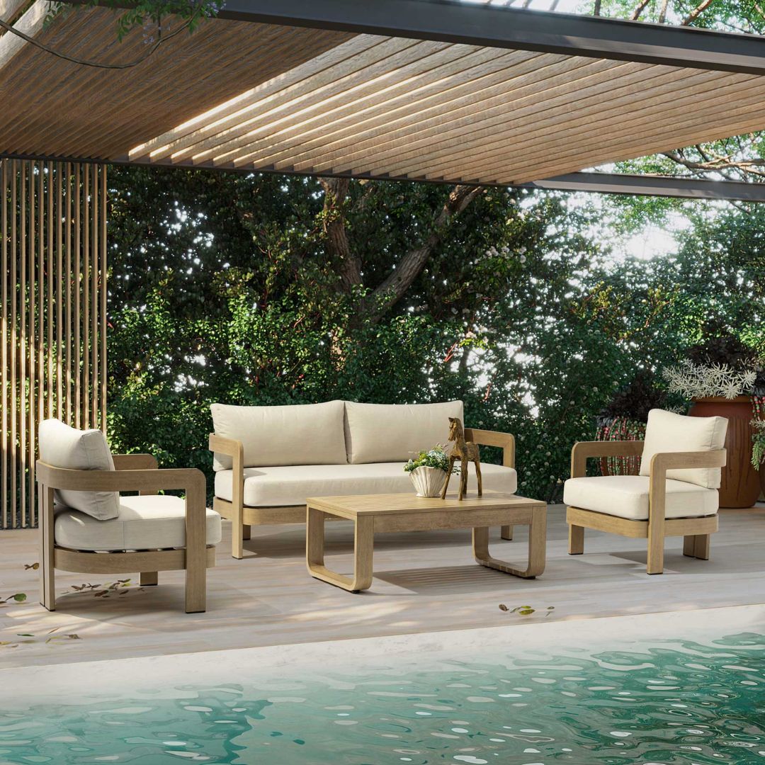 סט ריהוט גינה סלוני איכותי, מיוחד ואלגנטי, עשוי שלדת אלומיניום דמוי עץ – עמיד בתנאי חוץ.