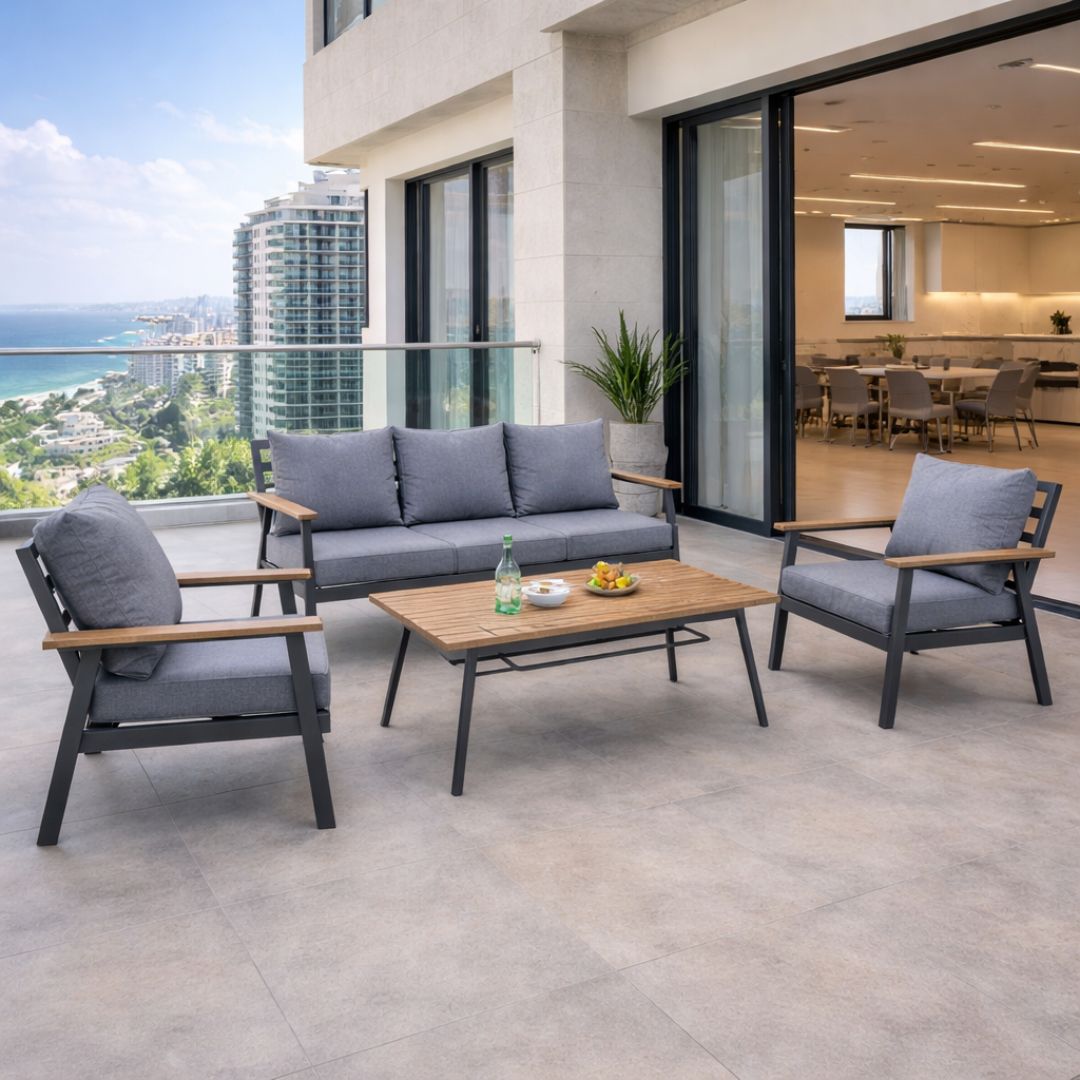 סט ריהוט גינה סלוני איכותי, מיוחד ואלגנטי, עשוי שלדת אלומיניום עמיד בתנאי חוץ.