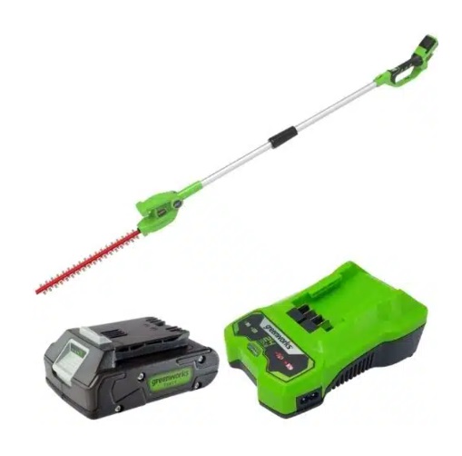 מגזמת גובה נטענת מסדרת 24V של GREENWORKS מציעה פתרון מקצועי לגיזום גדרות ושיחים גבוהים.