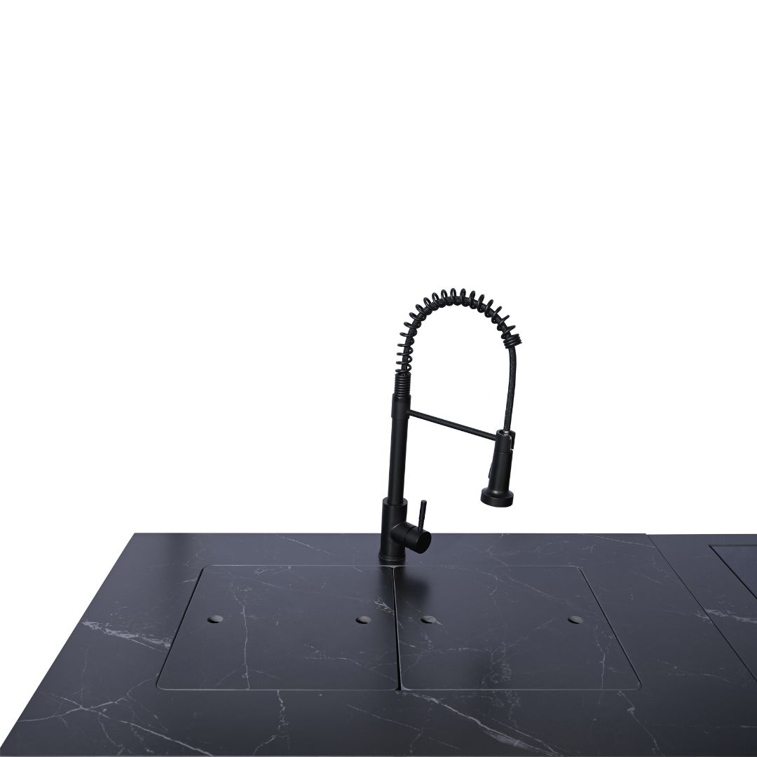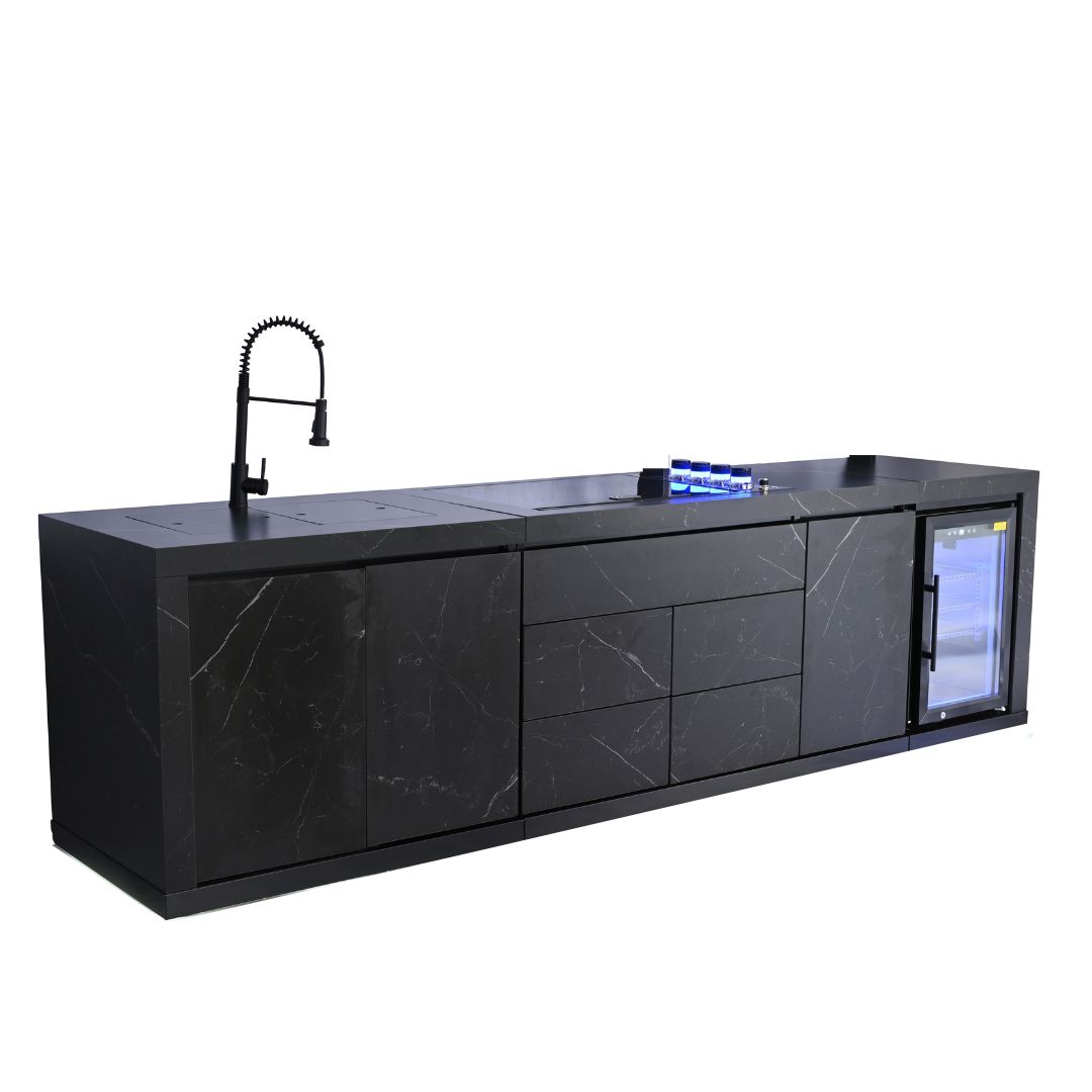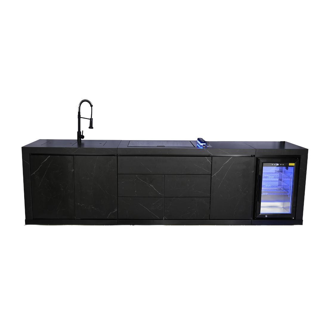 כיור גדול מובנה, מקרר חיצוני בנפח 63 ליטר, 2 לוחות חיתוך מאבן סונטה וברז שחור דומיננטי – כל אלה משתלבים יחד ליצירת חוויית בישול שלמה.