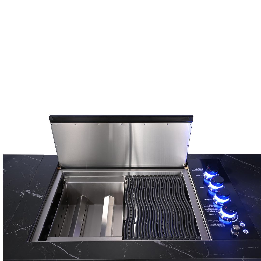 כולל גריל גז חיצוני מפואר עם 4 מבערים ראשיים, גריל ברביקיו נפתח, תאורת כפתורים כחולה ותאורת קרקע לבנה ליצירת אווירה יוקרתית גם בשעות הערב.