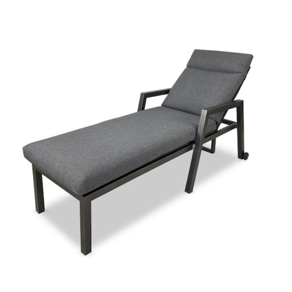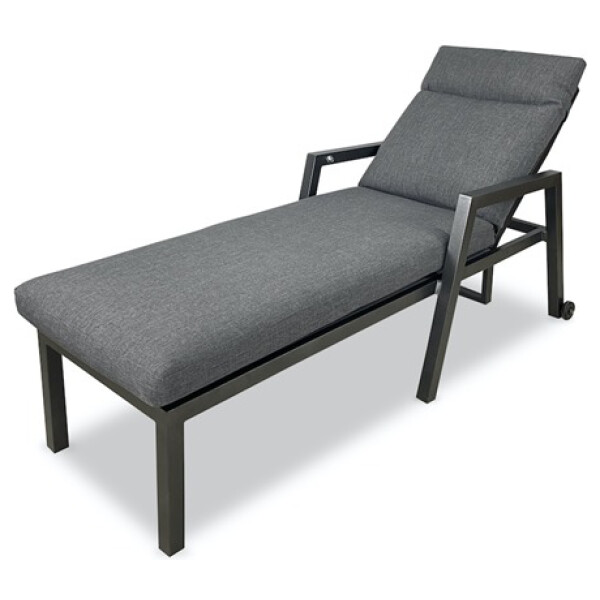 מיטת שיזוף עשויה אלומניום בצבע אפור משולב בד סלינג איכותי בגוון אפור בהיר. למיטה משעני זרועות עשויים עץ