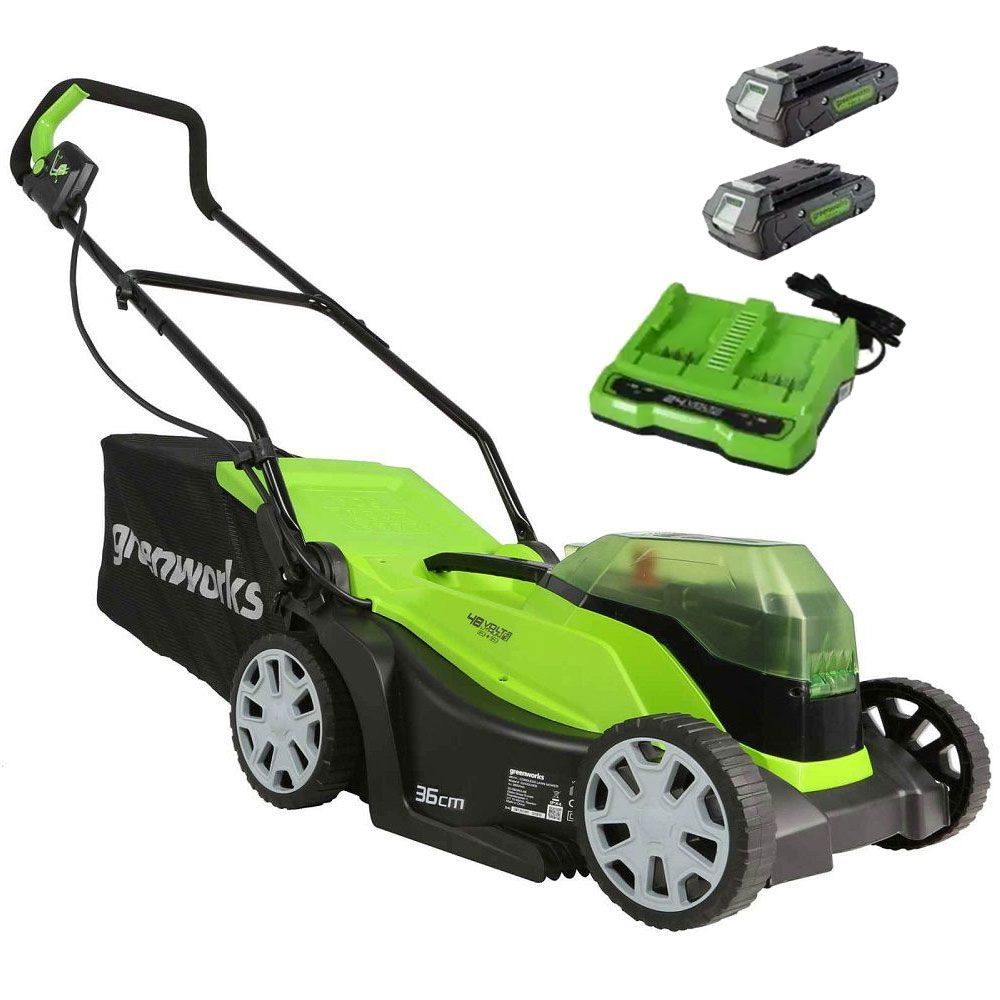 מכסחת דשא מקצועית 48V עם מנוע Brushless ורוחב כיסוח 36 ס"מ. כוללת שתי סוללות 2 אמפר ומטען כפול לביצועים מתמשכים.