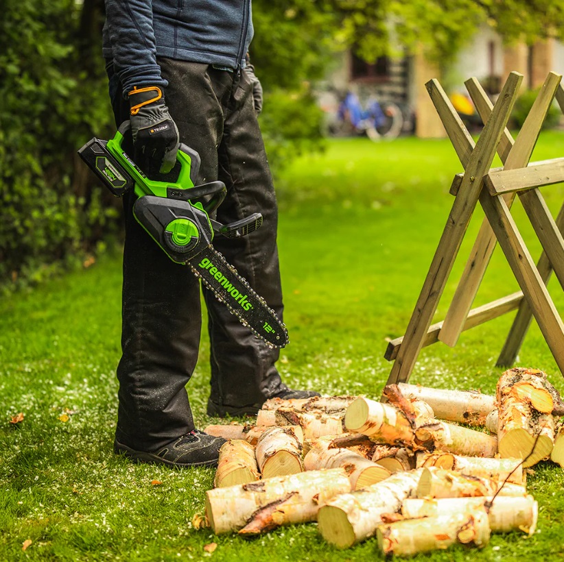 מסור שרשרת מתקדם מסדרת 24V של GREENWORKS, המשלב עוצמה וניידות בעיצוב קומפקטי. ערכה המלאה כוללת שתי סוללות 2 אמפר ומטען כפול 2 אמפר לעבודה רציפה.
