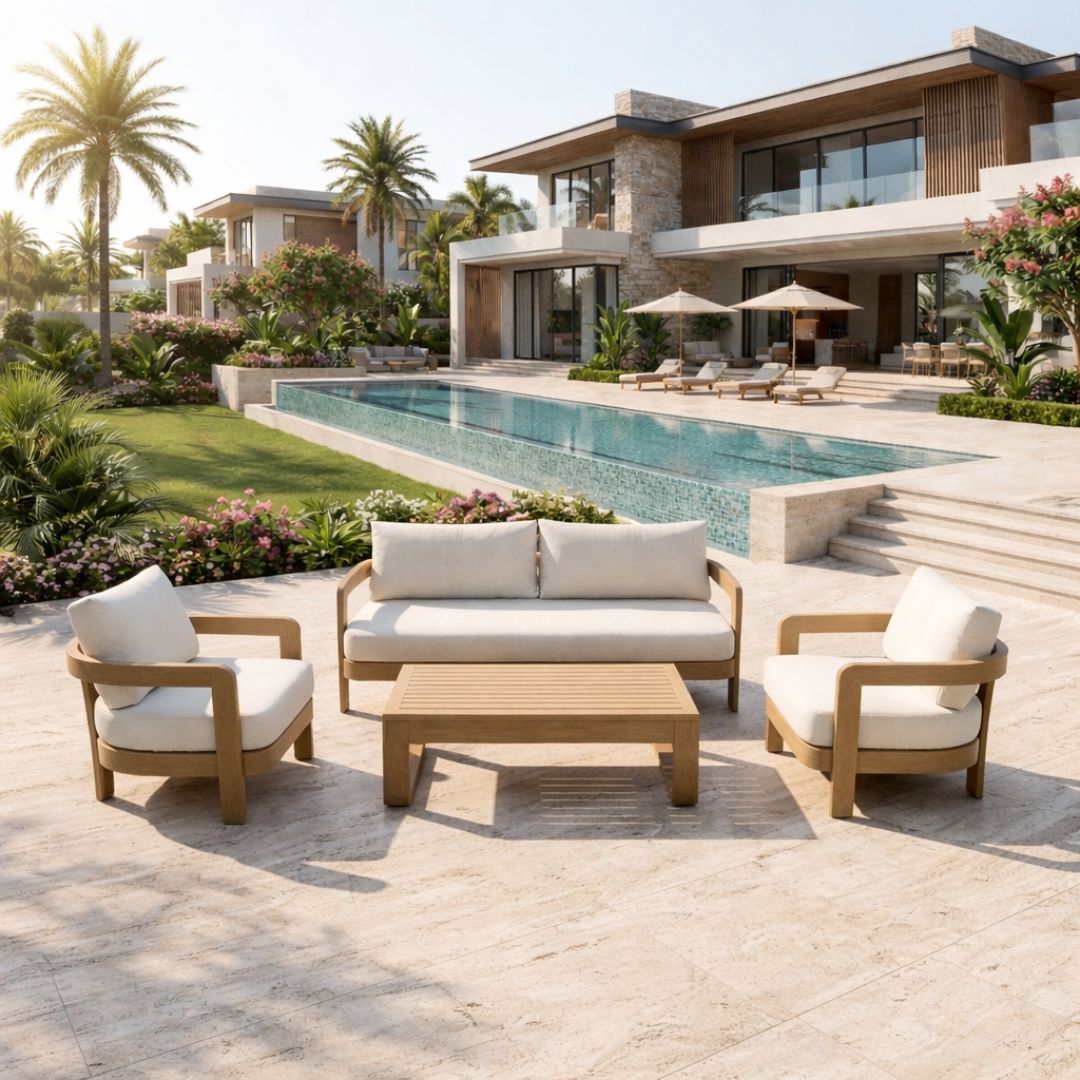 סט ריהוט גינה סלוני איכותי, מיוחד ואלגנטי, עשוי שלדת אלומיניום דמוי עץ – עמיד בתנאי חוץ.