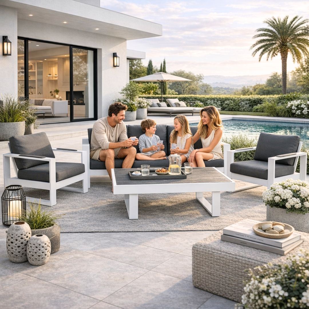 מערכת ריהוט גן סלוני איכותי. מתאים לשימוש בבית, במרפסת ובפרגולה.