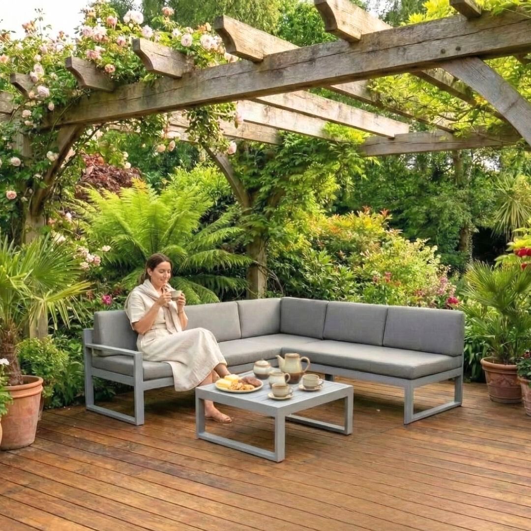 הסט כולל ספה פינתית עם גב מתכוונן כמיטת שיזוף.