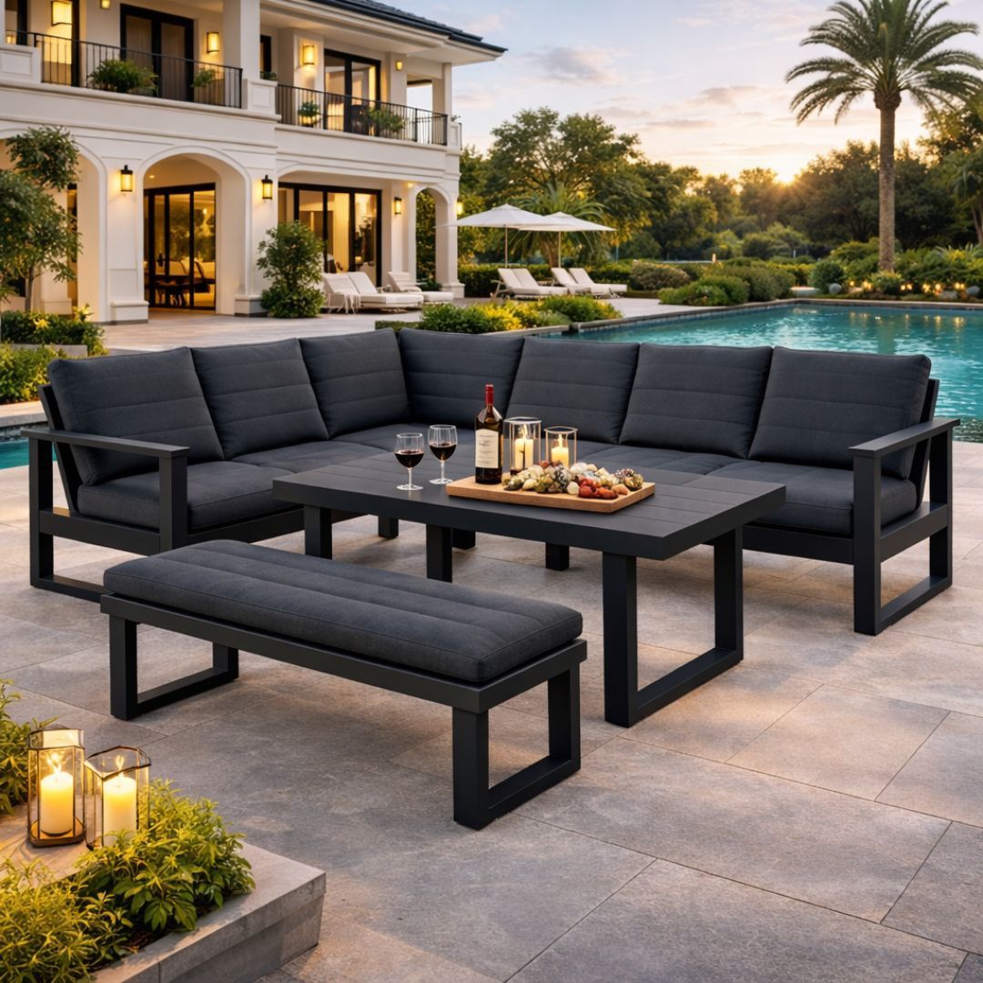 בעל שלדת אלומיניום, כריות עבות ונוחות ושולחן מלבני גבוה.