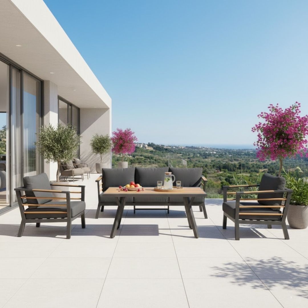 מערכת ישיבה סלונית לגינה מדגם פלרמו בצבע שחור משולב עץ